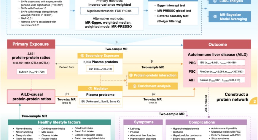 •通过整合pQTL(蛋白质数量性状位点)、rQTL(重组蛋白质数量性状位点)和中介效应分析,构建自身免疫性肝病的蛋白质-蛋白质相互作用网络